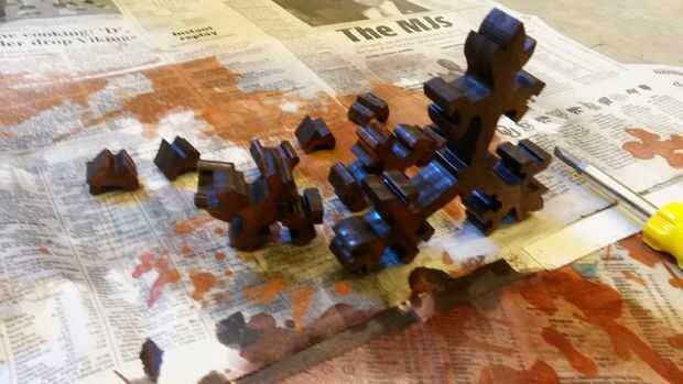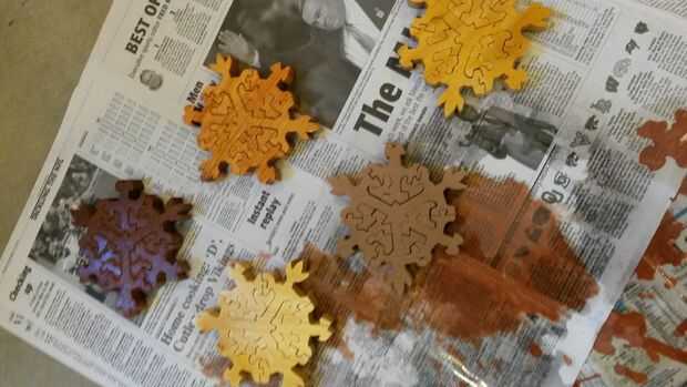 Se tiñen de colores diferentes de copos de nieve todo. He encontrado que es más fácil soltar las piezas en una lata de tinte, pescado hacia fuera y limpiar con toallas de papel. Que seco, poner rompecabezas juntos otra vez y rocíe ambos lados con el esmalte transparente. No quiero barnizar los bordes interiores de las piezas del puzzle a menos que se ha adelgazado abajo, apenas como un sellador. Para la capa superior me gusta 'Triple espesor esmalte' de Rustoleum.