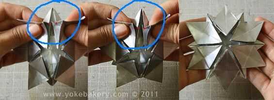 Vuelta.  Entre cualquier dos grandes aletas es una aleta pequeña.  "Adelantar" cada una de las aletas pequeñas. Mire bien las imágenes izquierda y central como guía.  Al final del paso, obtendrás 6 formas de cometa-como (imagen de la derecha).