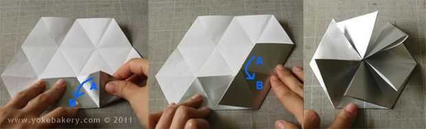 Doblar un borde del hexágono al centro otra vez. Utilizando las líneas de pliegue formadas en el paso 6, doble aleta A aleta B (imagen izquierda). Realizar el mismo patrón de pliegue de doblar repetidamente A la aleta a aleta B (imagen central), hasta llegar a una forma de molinete. En la última solapa, puede encontrar un pequeño problema de la última aleta se oculta bajo los pliegues. Simplemente tire hacia fuera para conseguir todas las 6 aletas pegarse hacia fuera (imagen derecha).