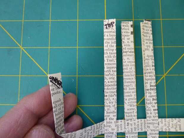 * Después de colocar un punto de pegamento en el borde marcado arriba, gire la parte inferior de la tira hacia la izquierda por lo bajo se enfrenta. Gire de manera similar, parte superior hacia la parte posterior para que la parte superior se coloca sobre el marcado de la franja deen. Fije con una pinza/clip de papel y repita en cada esquina.