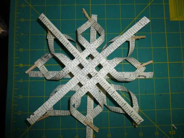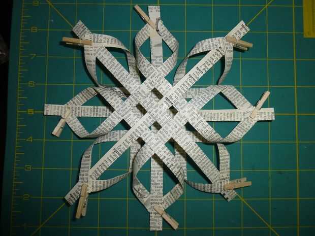 * La tira de centro recto de un copo de nieve en el bucle de la otros copo de nieve, que se extiende 1/2"-3/4" más allá de la esquina del lazo de la armadura. Esta parte puede ser un poco torpe así que use un pinza/clip para mantener temporalmente en su lugar. Repita en las 8 esquinas.