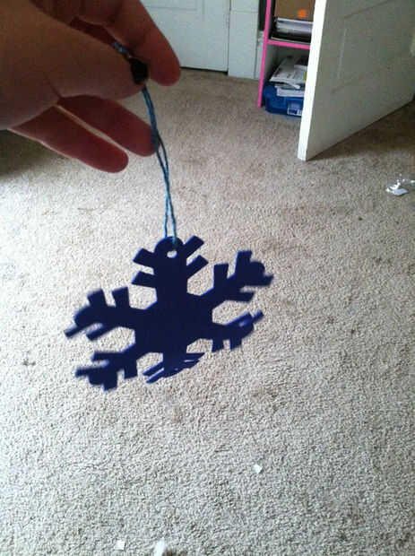 y luego poner la cadena a través de un agujero de tus superior copos de nieve y nudo los extremos juntos para hacer un anillo, por lo que puede colgar en un gancho o perilla de la puerta, etc..