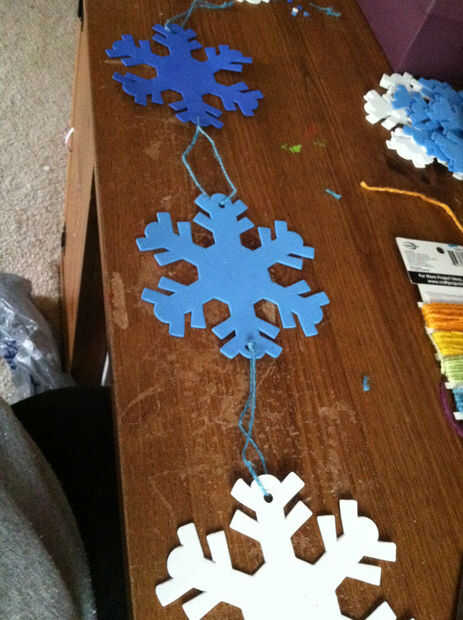 Ahora atar los hilos a través de la parte inferior del primer copo de nieve y la parte superior de la segunda y continuar hasta que todas las piezas están juntas. Recuerde que debe mantener el hilo flojo, para que cuelgan aparte.