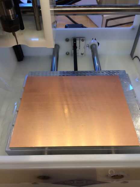 Fije la placa de circuito de FR-1 en blanco para cama de Othermill con cinta de doble cara. Si el soporte de la rótula esté en su lugar, retírela y asegúrese de que la esquina inferior izquierda de la FR-1 quede al ras con los bordes de la cama. Me gustaría dejar algunas cintas extra colgando de los bordes para facilitar la extracción posteriormente.