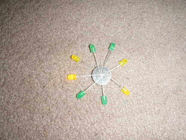 Tomar 1 LED y poner el largo de alambre para el lado de la batería de reloj +. Luego coloque el lado corto en el otro lado de la batería. Hacer esto por 7 LEDs más y orientarlos cómo desea.