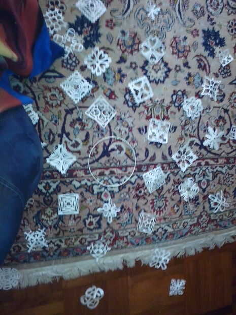 Para distribuir bien las escamas hice cinco hilos con cuatro escamas, cinco hilos con tres hojuelas, ocho hilos con dos hojuelas y ocho con una escama.