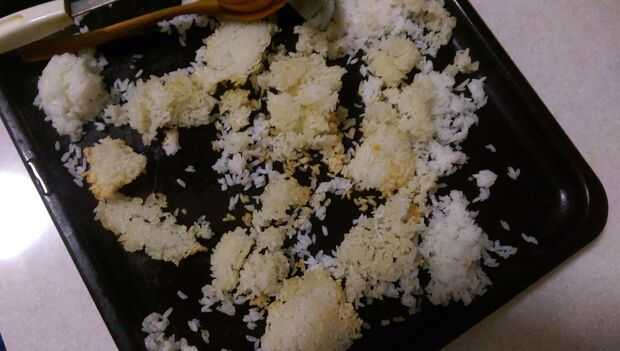 Normalmente, el arroz está cocido por verter agua en el arroz y dejar hervir. Sin embargo, esto hará que el arroz demasiado mojada incluso después del secado amplia, llevando a grupos irregulares de crocante frito y no para fritos como puede ver en la imagen de este último.