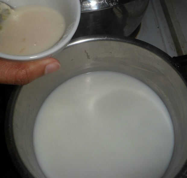 -Disolver la harina con agua y agregar lentamente la pasta mezclando para que no se ven grumos. Harina se agrega a la consistencia espesa de forma.