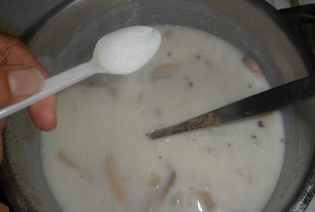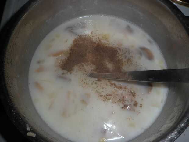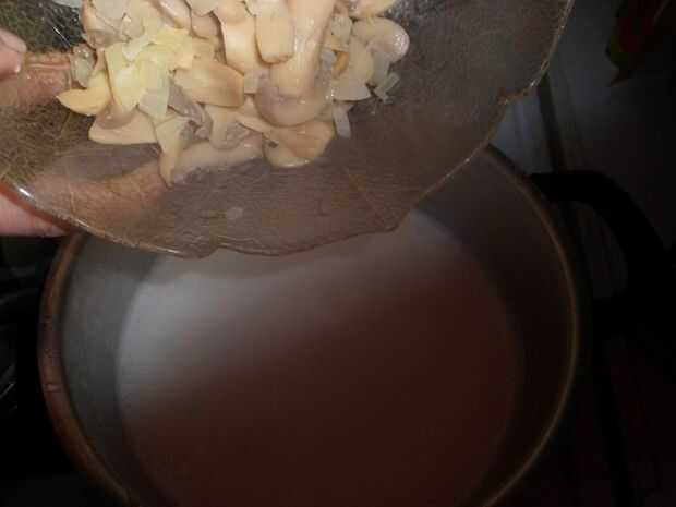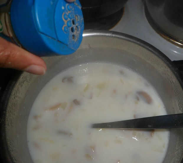 -Tome otro vaso, combinar 1 taza de leche con 1 taza de agua y lleve a ebullición. Añadir los champiñones y cebollas salteadas.