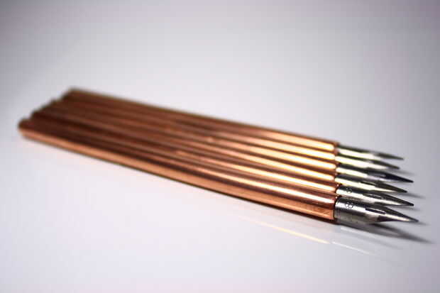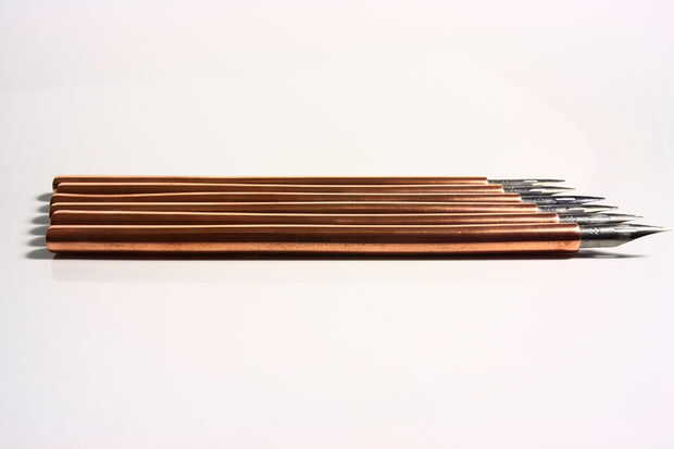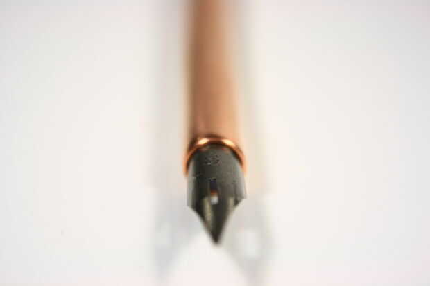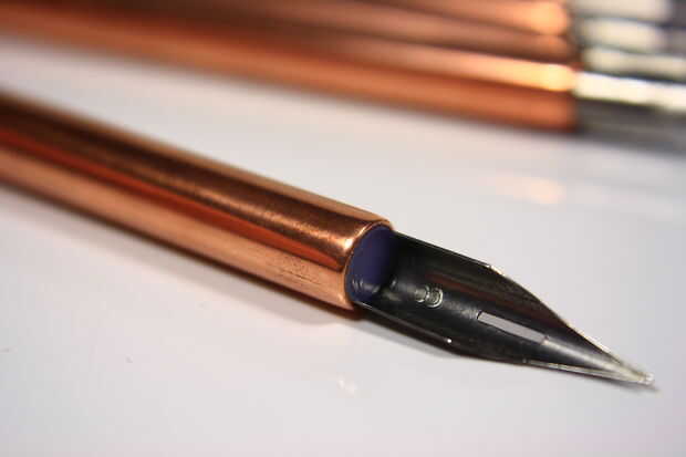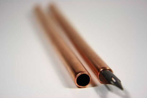 Aunque existen muchos tipos de plumas como esta, decidí diseñar y fabricar mi propio alrededor de un plumín existente. El diseño incorpora un componente disponible estándar (la punta) y la nueva aplicación de material de desecho (tubería de cobre) en su Asamblea. La semilla fue fabricada en Inglaterra y comprada localmente en Sudáfrica de un proveedor fijo. Los cuerpos de las plumas se cortan de tubería de cobre de la industria de la refrigeración (probablemente). El cobre luego es pulido a brillo, que también elimina las rebabas del borde. El diseño es sencillo - la punta encaja en el tubo de cobre y obtiene en condiciones de servidumbre en su lugar con un adhesivo termoplástico adecuado. Un prototipo de prueba ha estado en uso durante varios meses y resulta exitoso. El cobre deslustrará, que puede ser traído de nuevo a lustre si lo desea, con un conveniente latón/cobre compuesto para pulir. Personalmente la tinta y la empañada de cobre agrega a apelación de la pluma.
