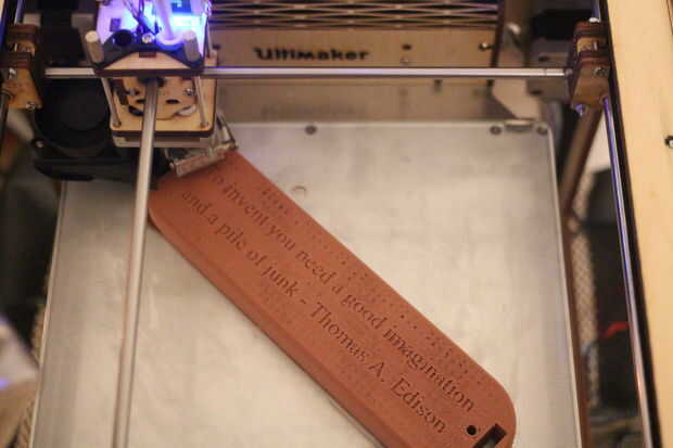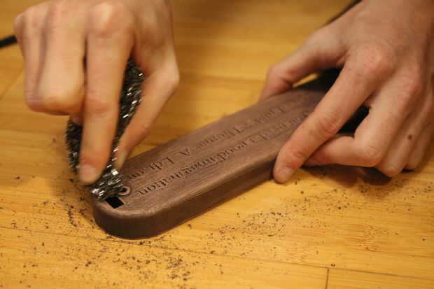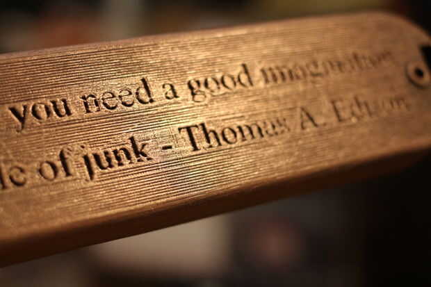 Usé el filamento Copperfill (de ColorFabb), debido a su bello acabado. Permite imprimir con real de cobre y bronce. Con un montón de lijado, pulido y tratamientos varios, las partículas de bronce empieza a brillo y reflejo. Porque la impresión contiene las partículas de cobre es realmente bastante pesado y por lo tanto contador equilibra el tubo de vidrio elevada.