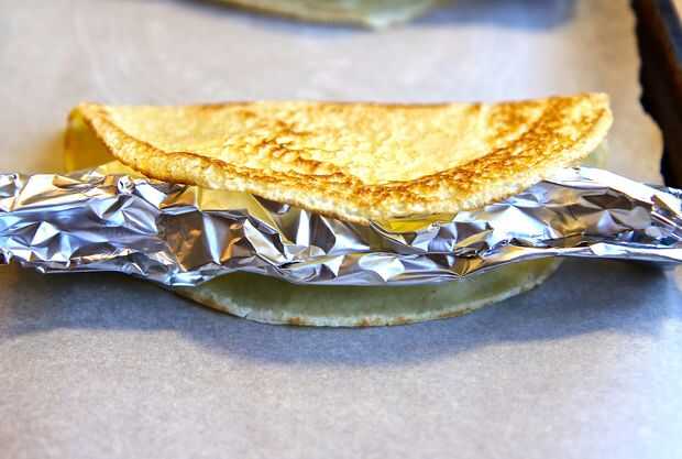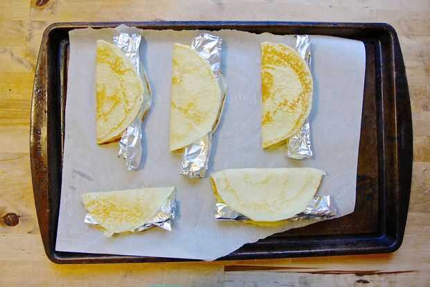 Línea tus galletas con pergamino o papel encerado. Cada uno de sus crepes doble por la mitad, poner en los lados de la hoja de galleta. Coloque un cilindro de papel de aluminio entre las dos mitades. Hornee a 325F (162.77 C) durante 5-10 minutos o hasta que es curruscante. He encontrado que ayuda a mantener tu taco shell forma así como subsistencia aun cuando le da la vuelta sus cáscaras del taco de crepe con su aluminio Inserte sobre a medio camino a través de su tiempo de cocción. Retirar del horno y deje que se enfríe.