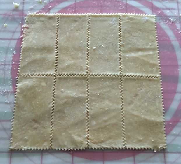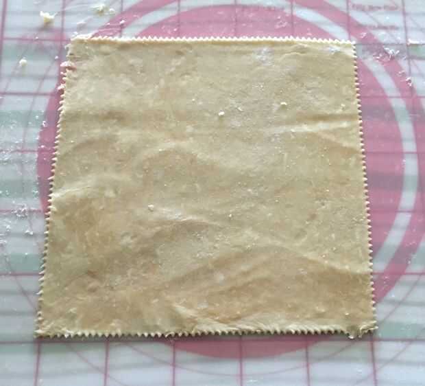 Tomar una cuarta parte de la masa de empanada (mantenga el resto de masa refrigerada) y rodillo, sobre una superficie enharinada, a un cuadrado de 10 pulgadas, de 1/8 de pulgada de espesor. (Estera rodante de un panadero con mediciones hace esto muy fácil!) Es más fácil rodar un poco más de 10 pulgadas y recortar los bordes con un cortador de pastelería.
