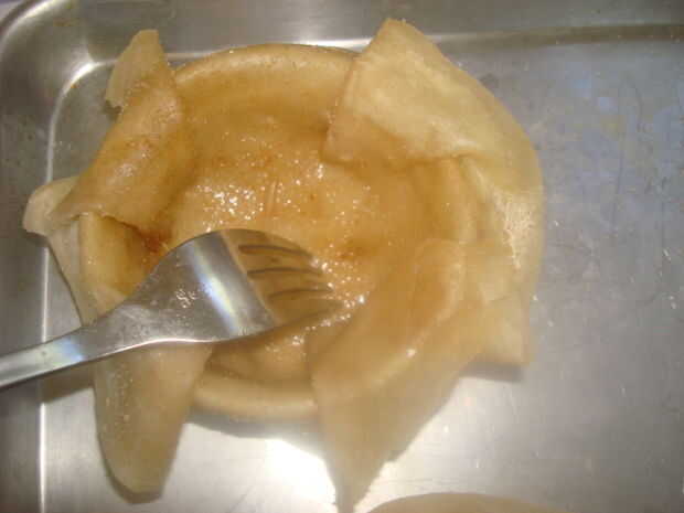Con cuidado coloque las tortillas revestidas en el recipiente de molde y la forma como se muestra en las imágenes.