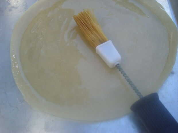 Utilizando un pincel de pastelería esparciremos una fina capa de la mantequilla derretida por ambos lados.
