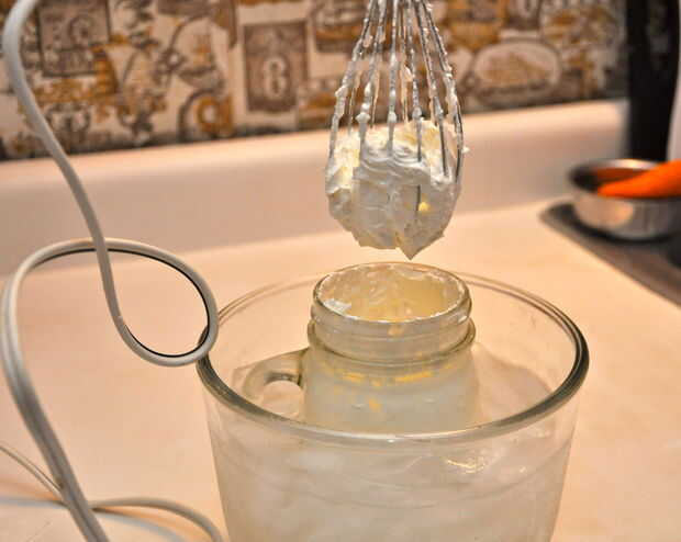 Después de agregar el azúcar, la nata espesará rápidamente. Deténgase cuando la crema se queda en el bate cuando es levantado de la jarra.