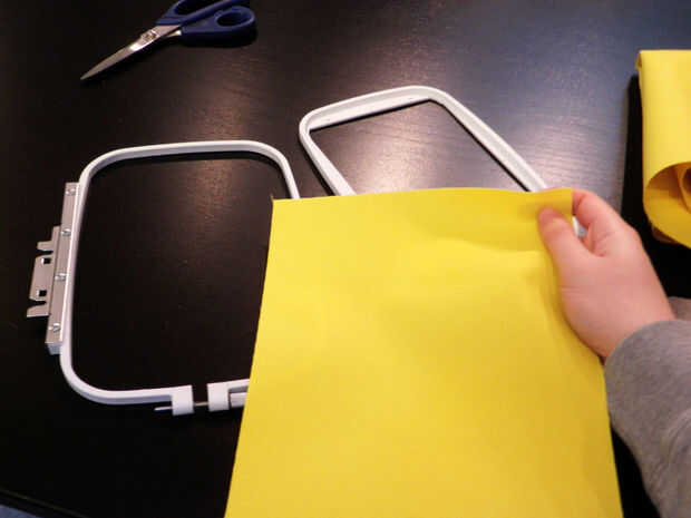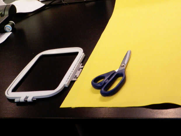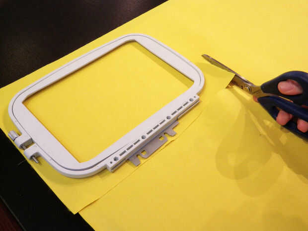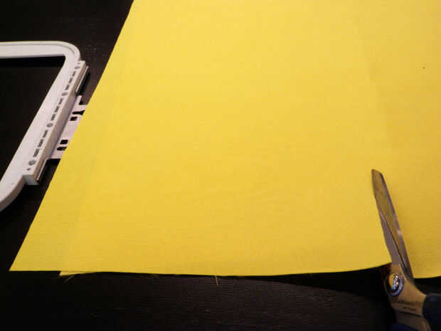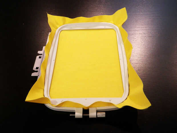 Cortar la tela para encajar en el marco de la máquina de bordar para que alrededor de una pulgada se peguen hacia fuera en todos los lados. Asegúrese de que la superficie de bordado se tira autodidacta y fijarlo en el marco.
