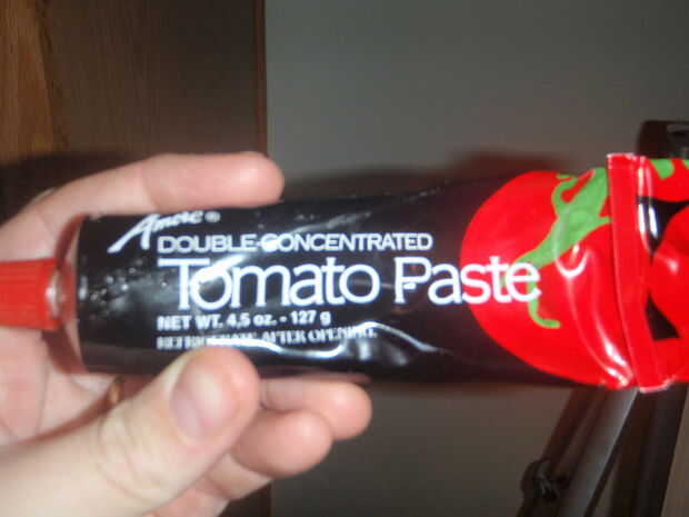 Pasta de tomate: me olvide de poner esto en el cuadro principal, para que reciba su propio. Que es bueno, porque te puedo mostrar el tubo fresco venden pasta de tomate. Manera más almacenable que las latas dang de mi juventud más joven.
