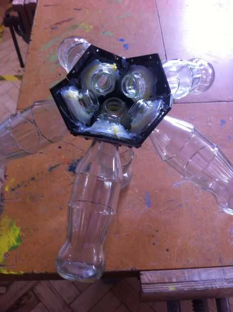He hecho mi lámpara en 2 mitades. Empujar una botella por cada Pentágono acrílico, seguro con una atadura y suave final en pegamento pistola de pegamento.