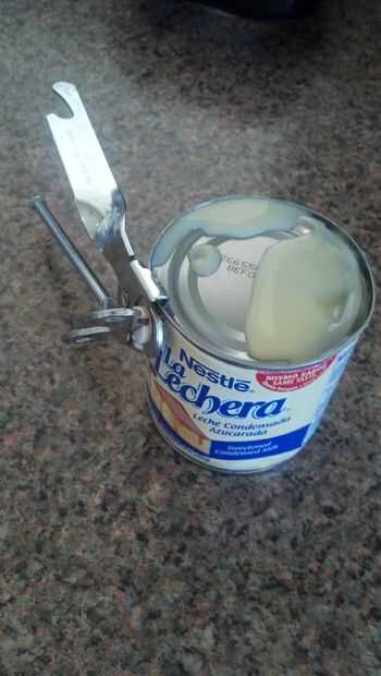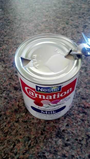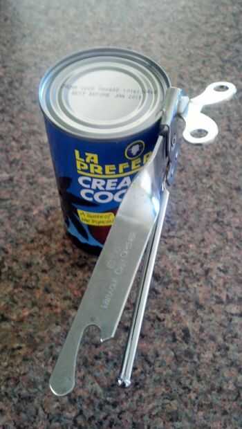 Es bueno tener todos los ingredientes listos antes de empezar a mezclar en la licuadora. Esto hará que sea más rápido. Abrir dos latas de crema de coco completamente. Porque la crema de coco no es muy líquida necesita la puede abrir completamente. Abrir la lata de dulce condensar la leche. Esto es también una mezcla espesa, si no abres la lata completamente se consume tiempo al verter en la licuadora. Por último, abrir la lata de leche evaporada. I abierto en ambos lados para hacer la leche sale de la lata más rápido. Consulte las fotos para imágenes del abrelatas que se necesitan para esta receta.