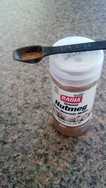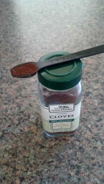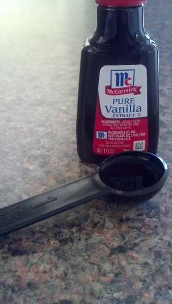 Medir el extracto de vainilla y sus especias. Recuerda que es 1/4 de cucharadita para el clavo de olor y canela, la nuez moscada es solamente 1/8 tsp, y el extracto de vainilla 1 cucharadita figura 4 se muestran las mediciones. Tenga en cuenta que tuve que improvisar con la medida de la nuez moscada porque no tenía un instrumento de medición de 1/8 tsp.