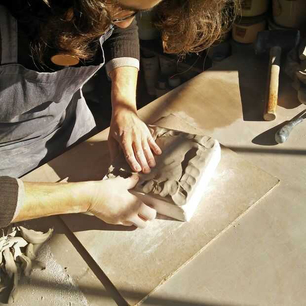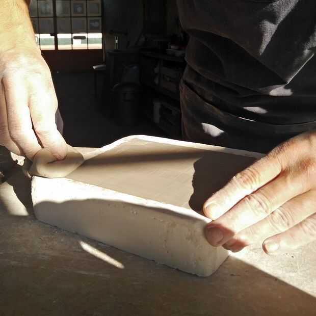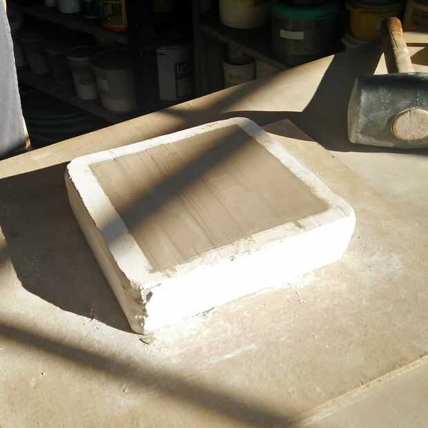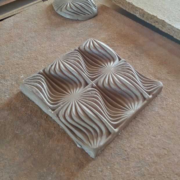 Una vez seco, el molde de yeso estaba listo para ser utilizado en la producción de azulejos. El primer paso fue comprimir la arcilla de gres en la superficie del molde, asegurando que todas las pequeñas cavidades y los bordes estaban llenos. Luego fue flatted la superficie superior y el azulejo cuidadosamente quita girando el molde boca abajo. Después, el azulejo se rectificó meticulosamente con algunas correcciones menores de borde.