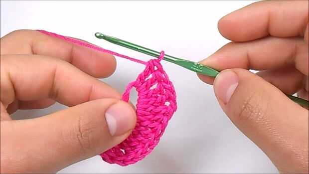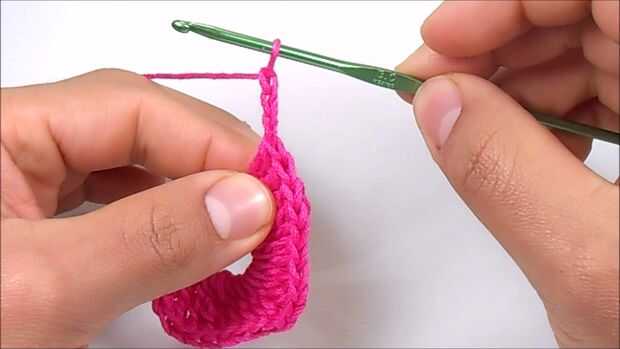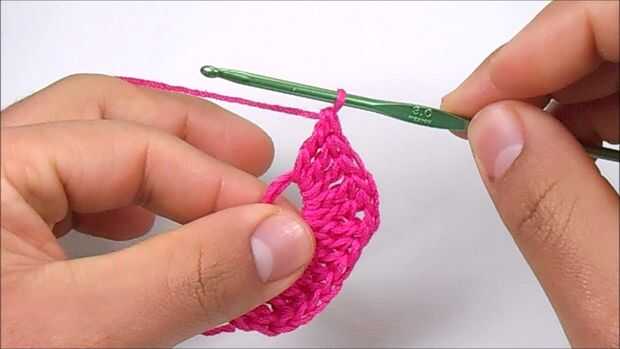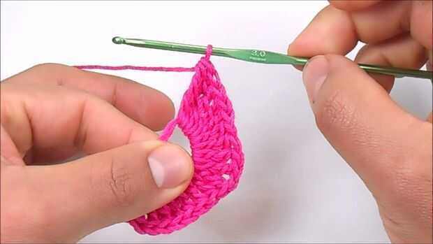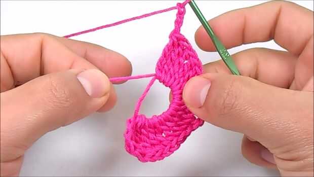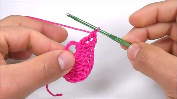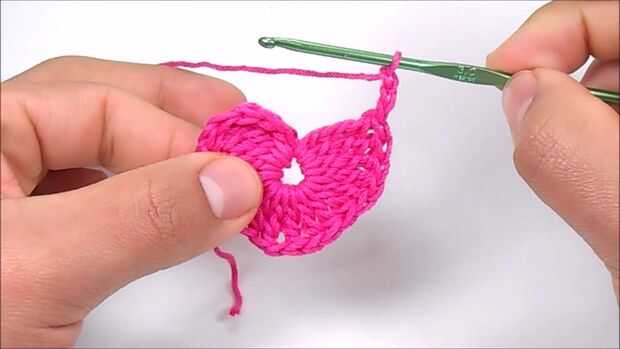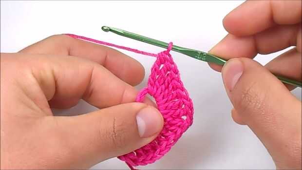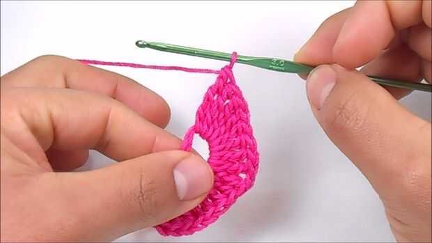 -Tres puntadas de cadena, cerrar un poco el anillo mágico y hacer una puntada de resbalón.