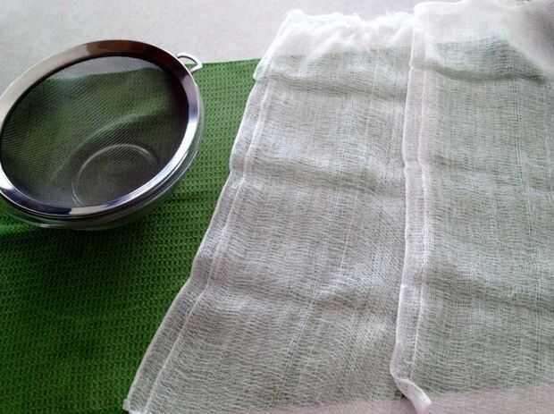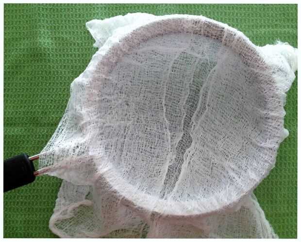 Humedecer la gasa con agua, escurra hacia fuera y ponerlos juntos para hacer una doble capa. Coloque la tela sobre el molde o filtro, presionando suave a lo largo de la base y las paredes y dejar el alero cae sobre los lados. Ponga a un lado.