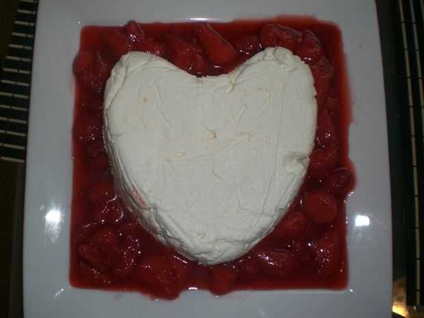 5. Invierta el corazón cremoso en un tazón de fuente/plato grande y superficial. Vierta alguna fresa salsa todo el exterior, por lo que el corazón está flotando en un charco de salsa roja.