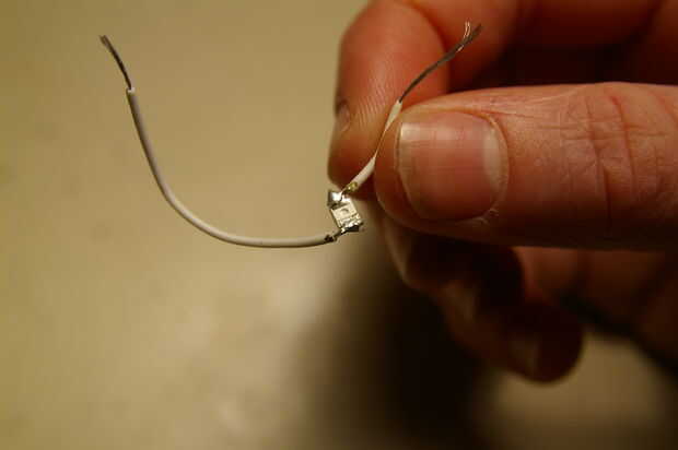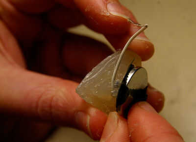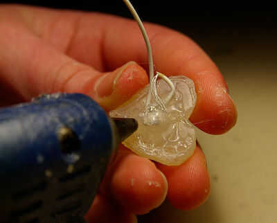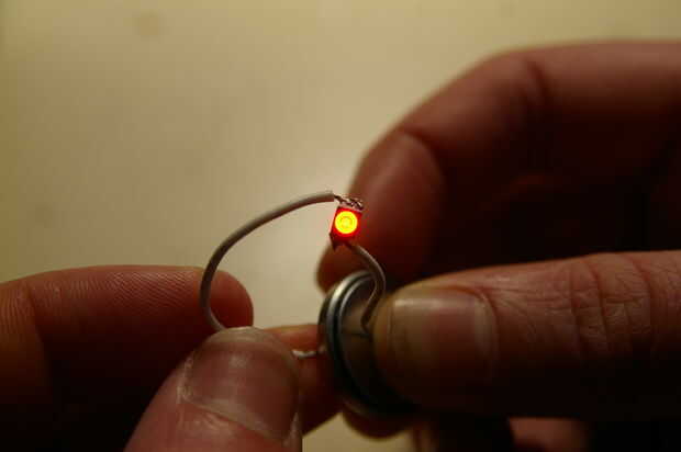Incrustar el LED en el centro por un pequeño agujero con la pistola encoladora de la fusión. Cinta extra larga desnudo sección del cable negativo a la CR2032, luego pegar la cinta aislante en pleno para fijar la batería.