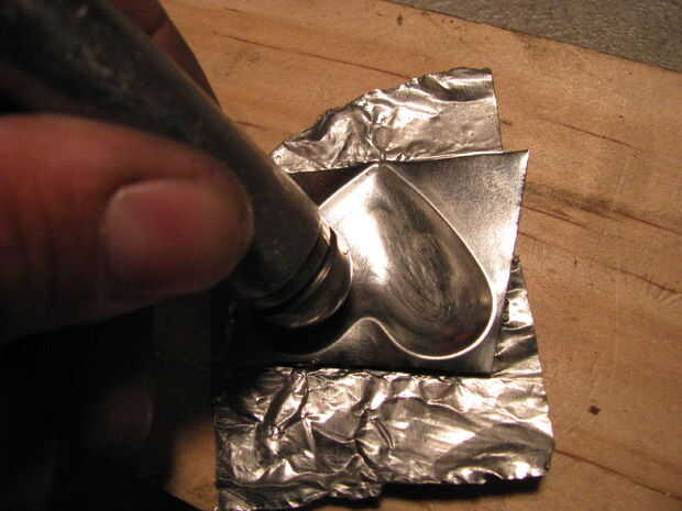 Ahora con la parte metálica hacia arriba, utilizar una parte de la Peña de un pequeño martillo para frotar la depresión. Usted sólo necesita moderada presión. Hacer esto hasta que la depresión es liso e incluso.