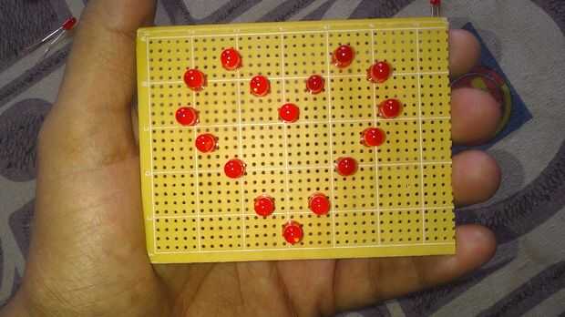 Como se aprecia en las fotos que he añadido a leds para hacer de una forma perfecta de corazón. No he empecé a soldar ni nada aún. Me tomó tres intentos para hacer un corazón de buena forma. Usted no puede hacer un corazón más alto o gordo, su hasta usted.
