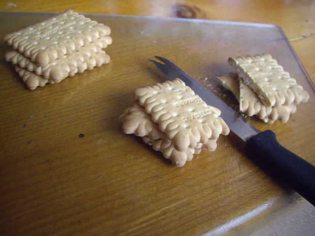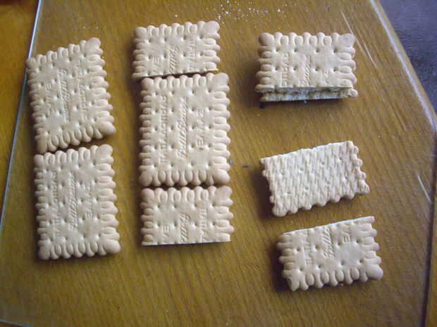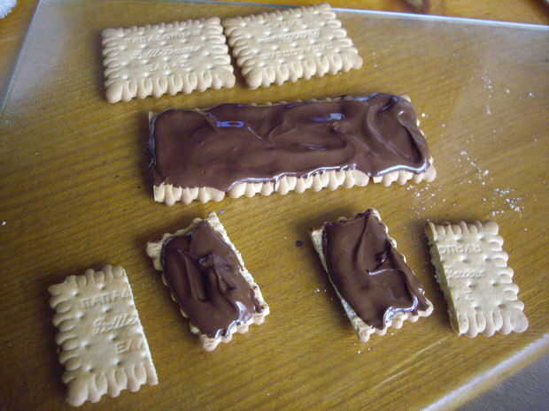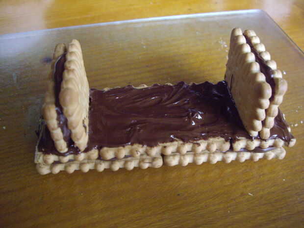 Fundir el chocolate en baño de agua. Entonces medio cuidadosamente 3 de las galletas y ponerlas en el orden mostrado. Pasta junto con el chocolate y dejar enfriar y colocar en caso de necesitan endurecer. En un pedazo de papel de hacer manos largas, los ojos y una sonrisa desde el chocolate que queda. Luego, ponerlos en el freidge.