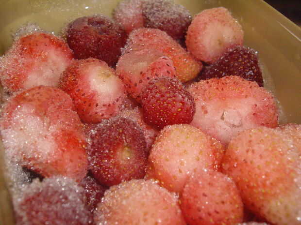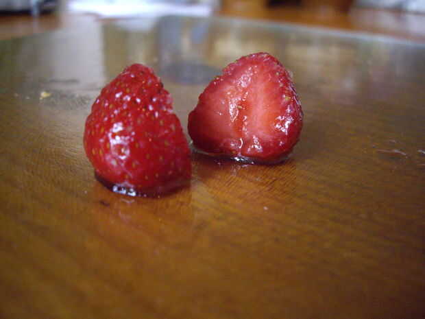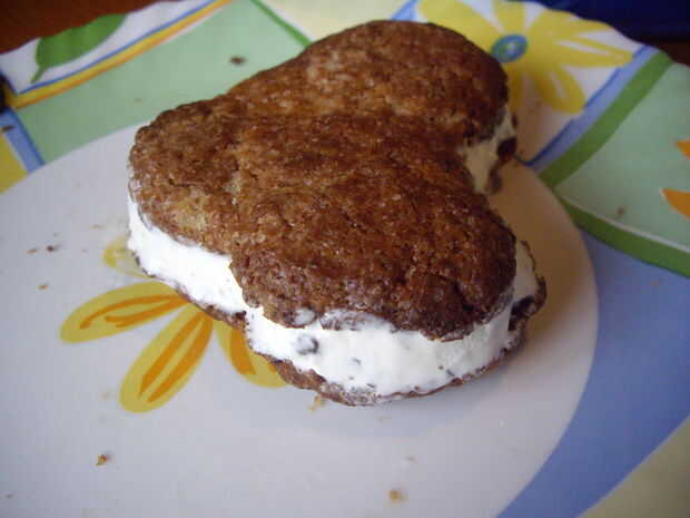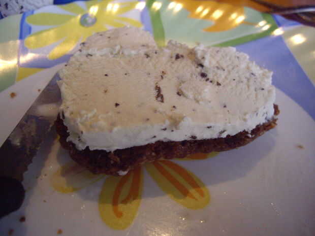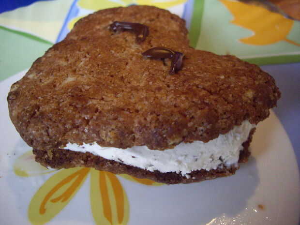 Tomar helado (usé stracciatella - favorita de mi novia), cortar algunas y borrón de transferencia en uno de los corazones. Poner el otro encima, para que se vea como un sándwich. Tomar las piezas de chocolate de la nevera y ponerlos en el 'snadwich cookie'. Tomar una fresa y se medio - que sería las patas de la Cookie. (También se pueden utilizar dos fresas o bayas de todo lo que te gusta.)