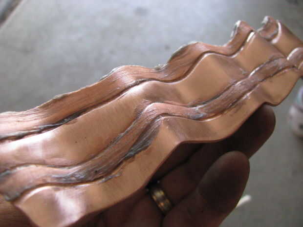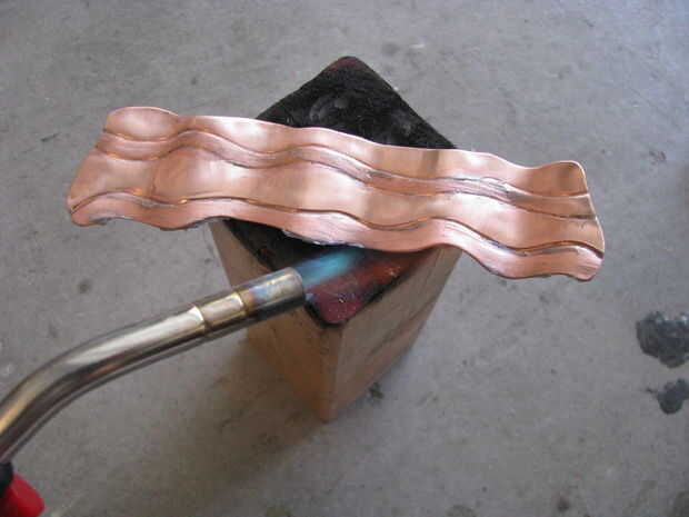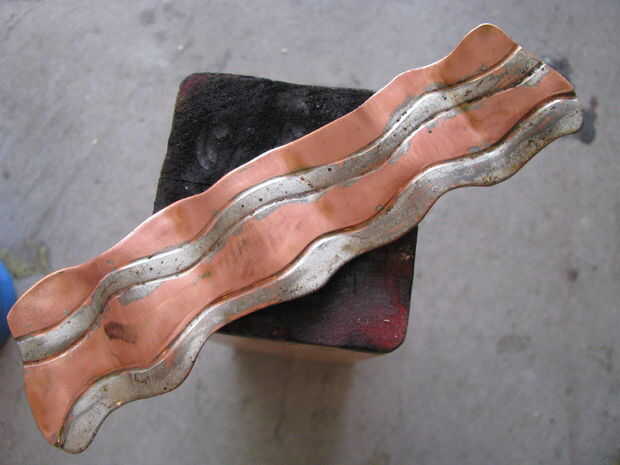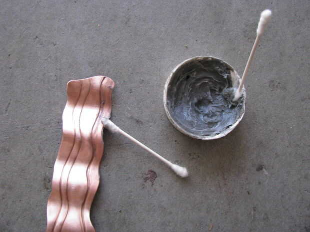 Romper la goma de flujo usado para soldar. Aplique la pasta a lo largo de las líneas de grasa. Utilice un soplete para calentar el cobre. El flujo será dejar un color plateado en él.