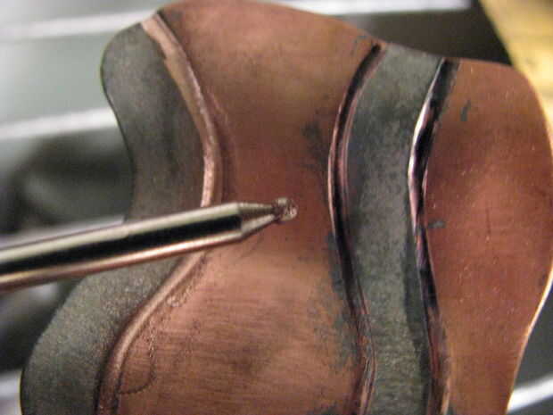 Utilice una broca de diamante de punto pelota para quitar el color de exceso de flujo de las líneas de relieve de alambre. A arena apagado el color sobrante de las piezas de carne más adelante.