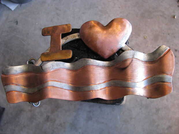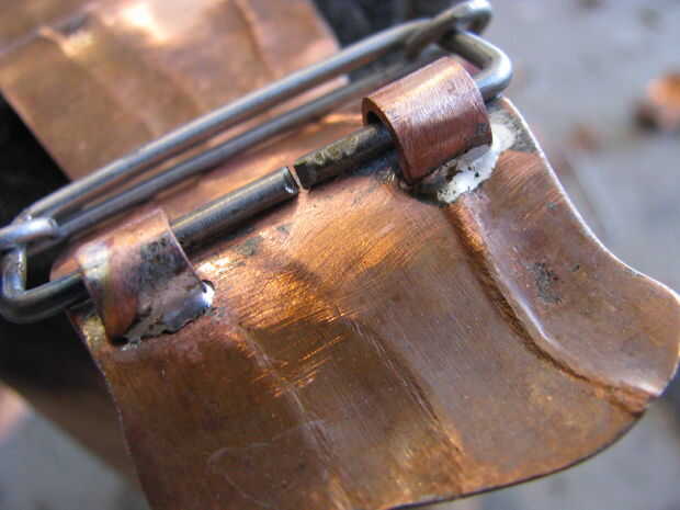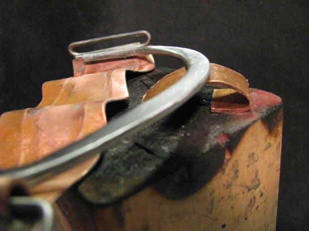 Centro del arco contra la parte posterior de la panceta. Para ayudar a mantener el arco en el rodillo del ángulo derecho de un pedazo de cobre y doblar una pestaña en ella para una mano de ayuda. Aplique fundente en las áreas correspondientes y lejos de la soldadura.