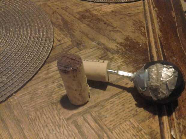 pegué los corchos en ambas direcciones con hojas de diente de tipo brocheta. Empezar por meter un agujero en cada corcho en el extremo pequeño del corcho. Asegúrese de que está cerca de la media.