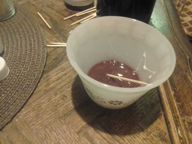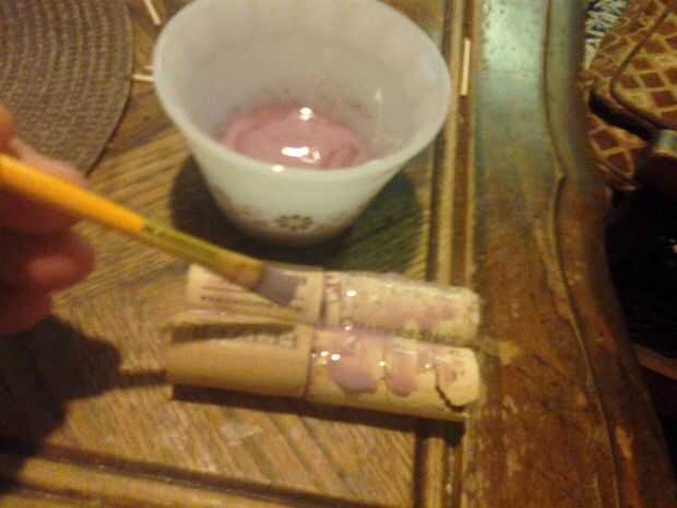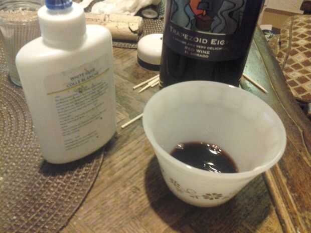 quería pintar los corchos con un color rojo claro. Decidí probar y utilizar las sobras de vino uno mismo. con un bol pequeño mezclar una pequeña cantidad de vino y un montón de pegamento. La seca de color más oscuro. Yo que tuve que dab en algunos de los corchos son corcho falso que parecen de goma y no tardaría el pegamento vino, pero secaba era más fácil trabajar con.