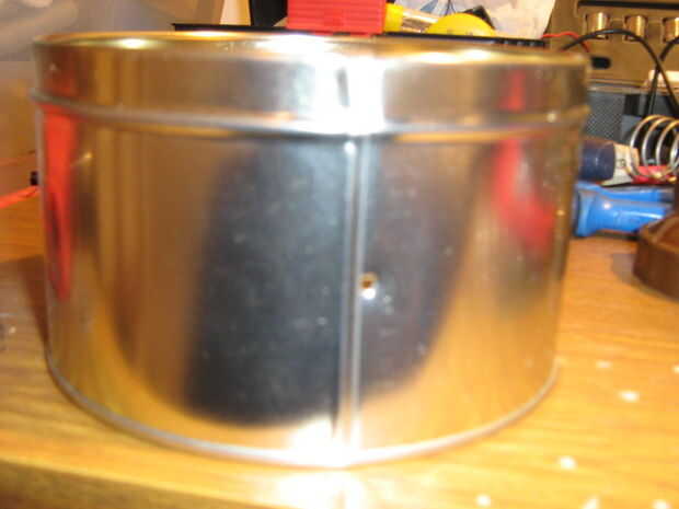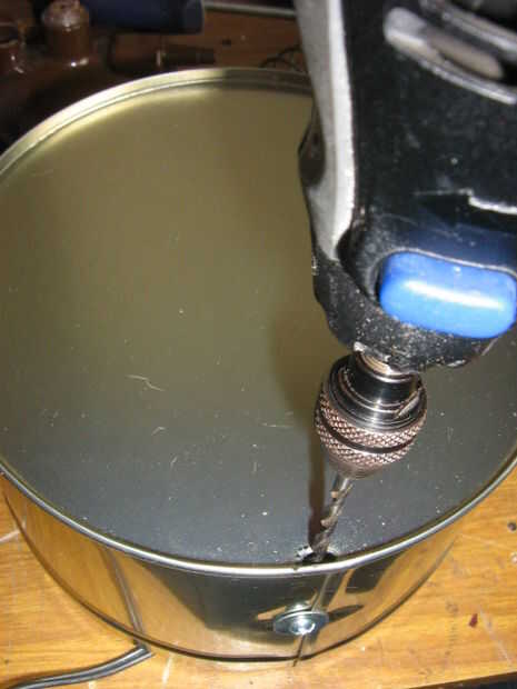 Hacer un agujero en la parte posterior de la lata, para pasar los cables a la parte exterior.