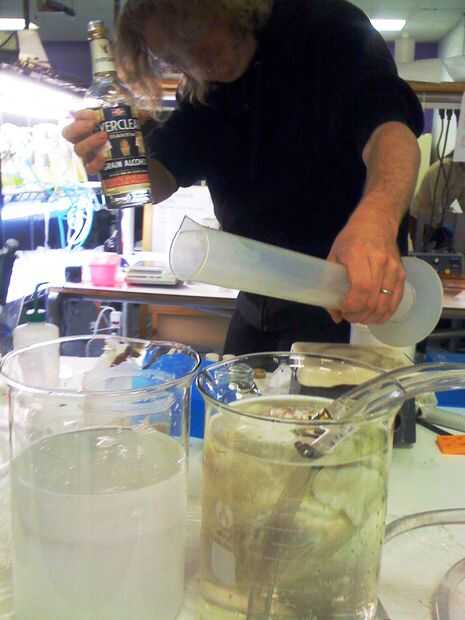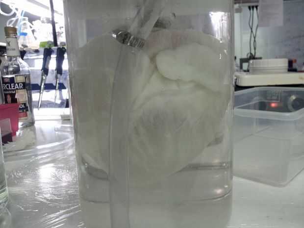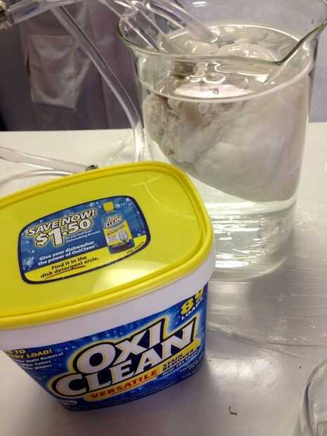 Este es el paso final donde el corazón se lava con una solución de oxyclean y etanol a desinfectar las bacterias que lograron quedarse en todo este proceso y eliminar cualquier célula última de los procedimientos anteriores. El protocolo oficial utiliza ácido peracético, un oxidante fuerte que puede producir usted mismo de vinagre y agua oxigenada. OxiClean funciona muy bien como oxidante, por lo utilizamos en su lugar.