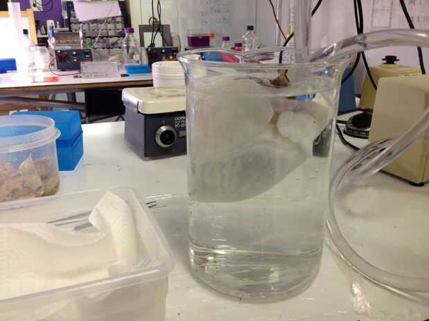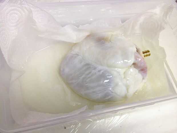 Una vez que se ha completado el paso desinfectante y usted haya completado el enjuague final de la solución salino puede quitar el corazón de los tubos. Déjelo escurrir - se utilizó una caja de plástico forrada con toallas de papel. Usted notará que el corazón del fantasma es bastante flexible en esta etapa y se desinfla como un globo como el agua sale.