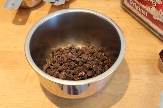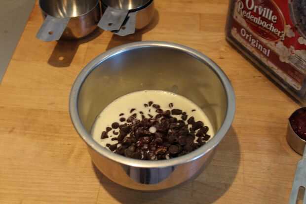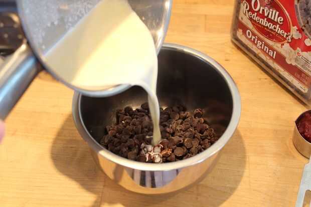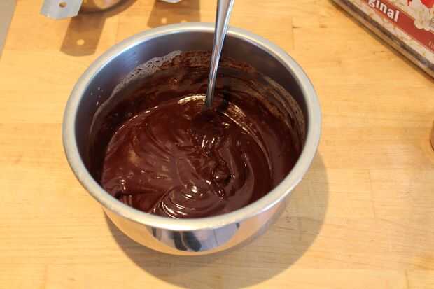 Vierta la crema caliente sobre el chocolate en un tazón pequeño. (puede hacer variaciones sobre los diferentes tipos de chocolate, como chocolate con leche, o lo que sea, como lo es levemente endulzado). Que se sientan por un segundo y luego revuelva hasta que totalmente liso y derretido.