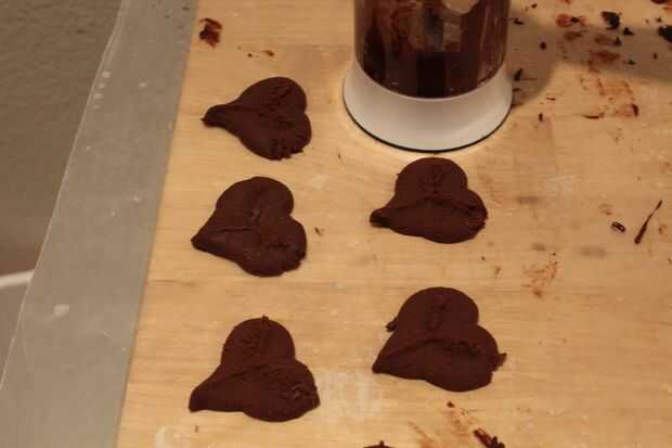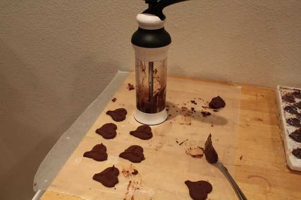 Este proceso determinará la forma de sus trufas. Y usted puede ser creativo aquí. Usé una prensa cookie (gané de instructables) para extraer la crema de chocolate refrigerada en pergamino.