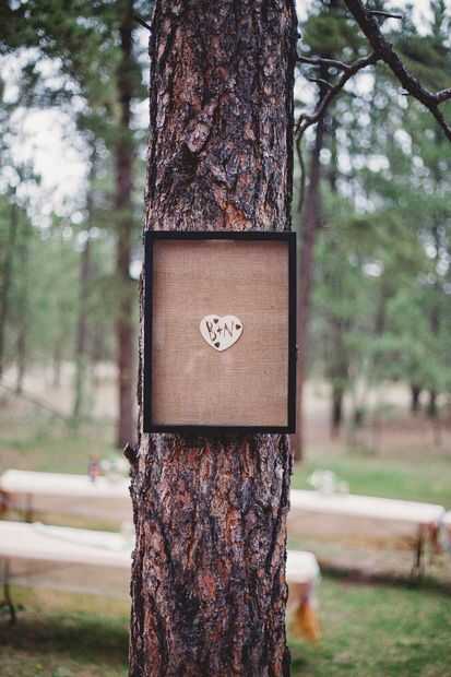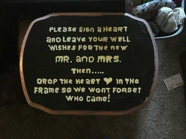 La boda fue un evento al aire libre en mi casa. Atamos el marco a un árbol en el sobre la cabeza en alto, que luego ponemos una pequeña mesita de madera debajo del marco con la placa. El cajón fue dejado abierto con los corazones pequeños de personas escribir su mensaje en. He dejado dos sharpies de punta fina negro para el invitado para escribir con.