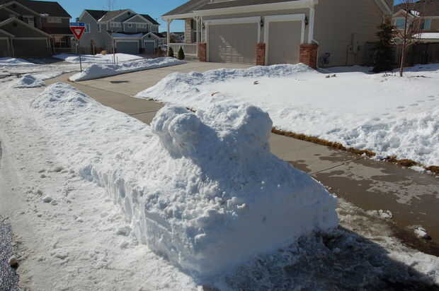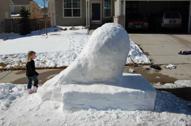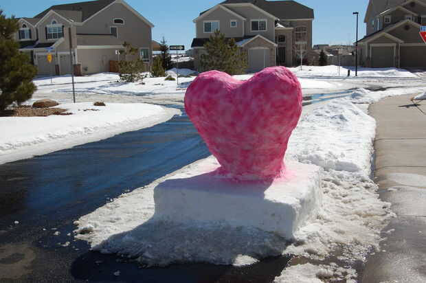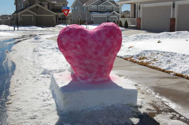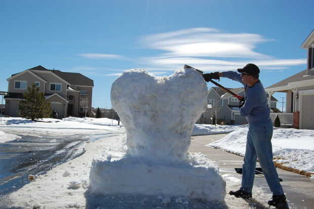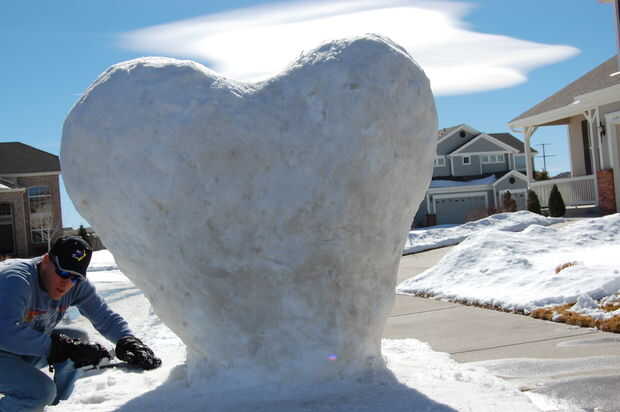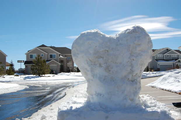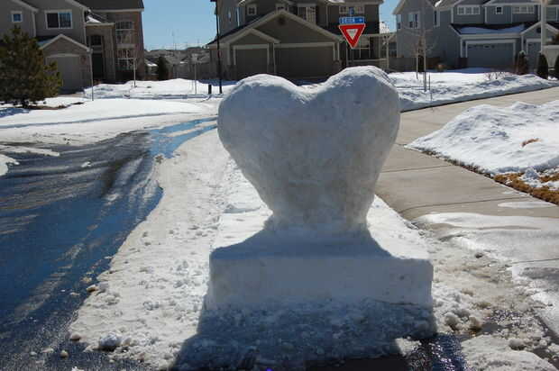 Esta pila comenzó grande después de palear toda la nieve del coche y las aceras de la semana pasada y hace una perfecta base para el corazón. A continuación, hice bolas de nieve muñeco de nieve-estilo y llenado para arriba, embalaje de nieve entre las bolas, ralentizando la acumulación de los lados utilizando algo más húmedas de nieve para ayudar a con la viscosidad. Construí un soporte en la parte posterior del corazón para darle algo más de masa para ayudar a durar un poco más de tiempo (esta no va a estar mucho tiempo con éstos sobre 60 temps!). Lo alisó hacia fuera, a mano del embalaje en el divits más pequeño y utilizando la parte posterior de la pala de jardín para suavizar los puntos altos.