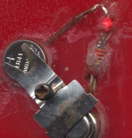 Luego extraer las pinzas, quitar el resto del papel protector, inserte las dos celdas como se muestra y mantienen en su lugar con algunos realizando cosas elásticas y un tornillo. El LED se encenderá, y los bordes de la hoja transparente brillará así.