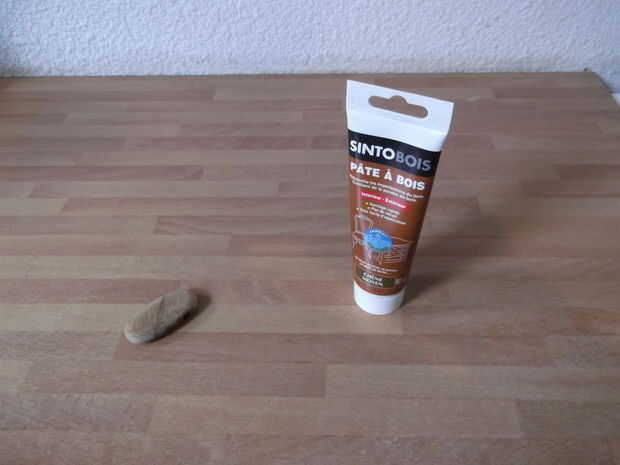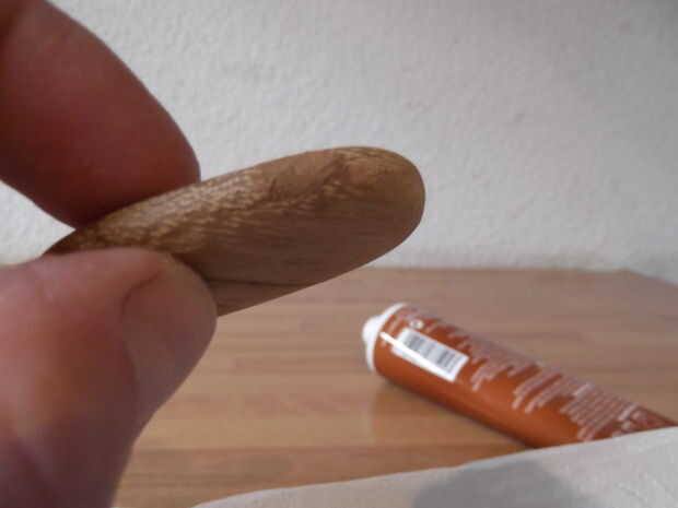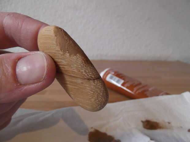 Poner alguna pasta de madera en los agujeros restantes. Tenga cuidado de usar el tinte adecuado. Prueba primero (no, gran error!). Deje que se seque. El exceso con papel fino de la arena. Lijar todo con grano más fino. Listo para el último paso!