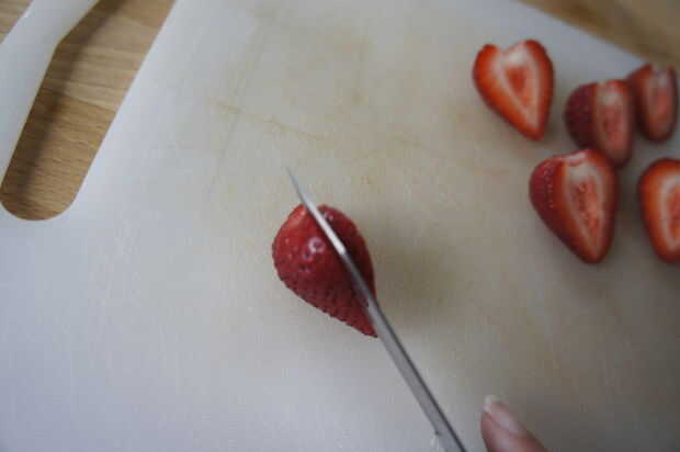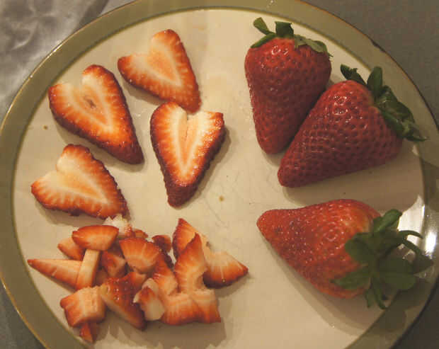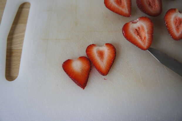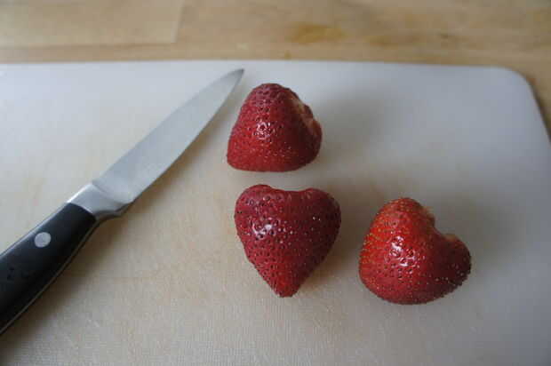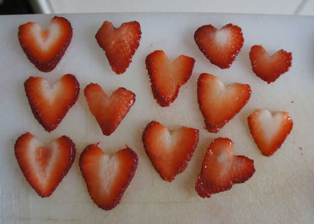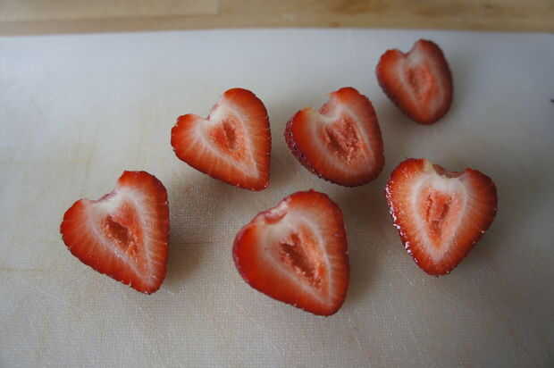 Ahora usted probablemente puede comenzar a ver el contorno del corazón en las rodajas de fresa que has hecho. Usando un cuchillo, recorte la parte superior de cada segmento para que los arcos son más pronunciados.