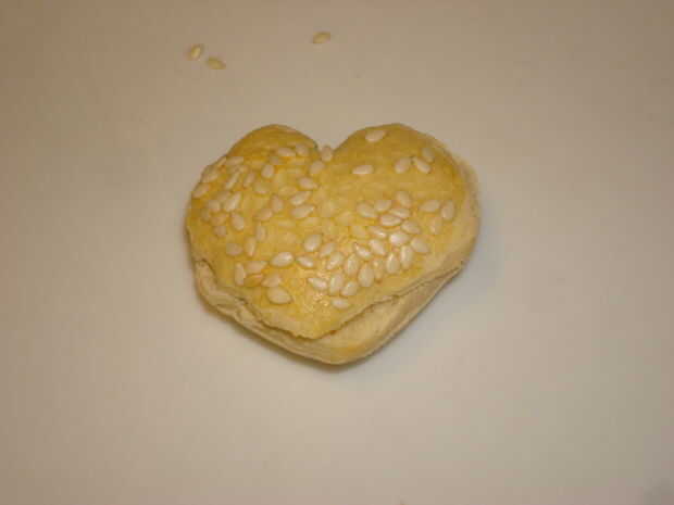 Sumergir las puntas del bollo en las semillas de sésamo. Él había espolvoreado con las semillas de sésamo, pero quería más cobertura.